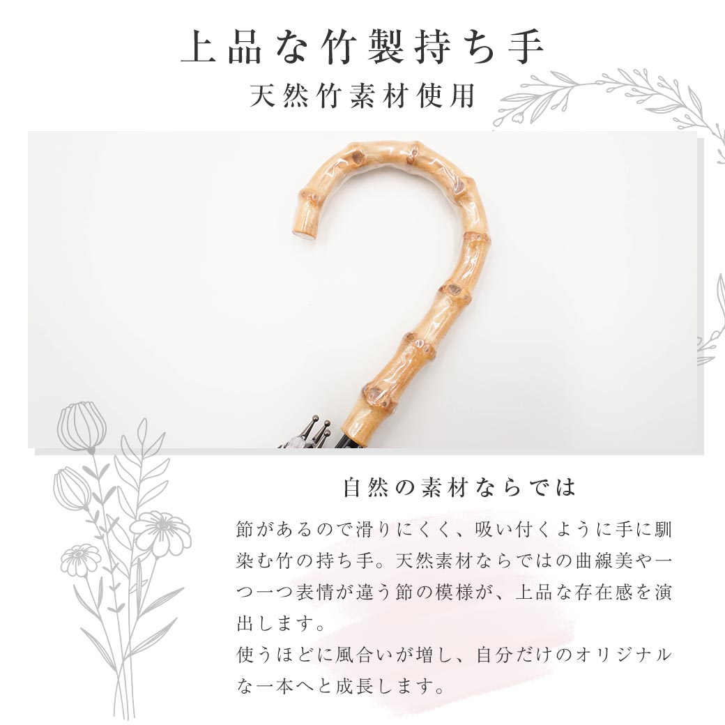 節があるので滑りにくく、吸いつくように手に馴染む竹の持ち手。天然素材ならではの曲線美や一つ一つ表情が違う節の模様が、上品な存在感を演出します。