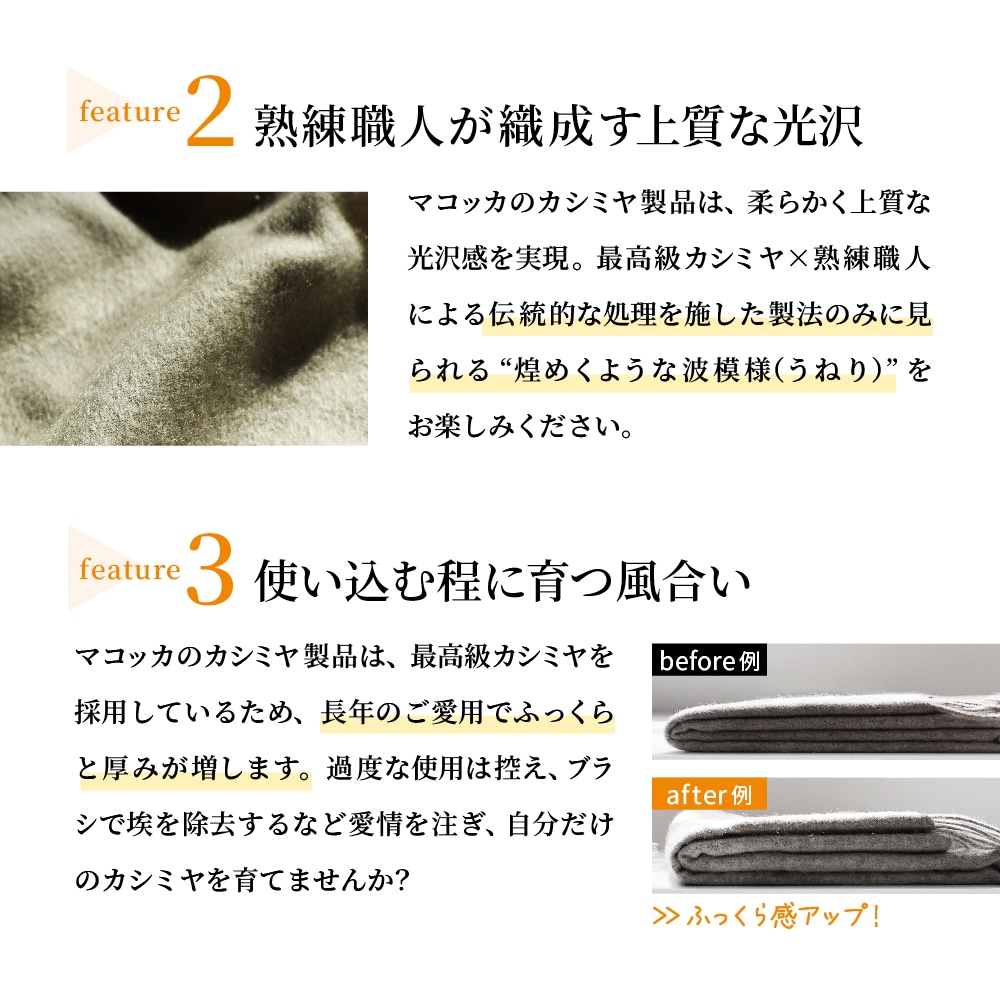 macoccaのカシミヤアイテムは、熟練の腕を持つ職人によって製造されています。繊細なカシミヤ素材を、伝統的な製法で起毛処理することで「滑らかな質感」や「上質な光沢感」が生まれます。高品質な素材と製法にのみ見られる、カシミヤ商品特有の波模様(うねり)をぜひお楽しみください。光に照らすとキラキラしてとってもキレイです。