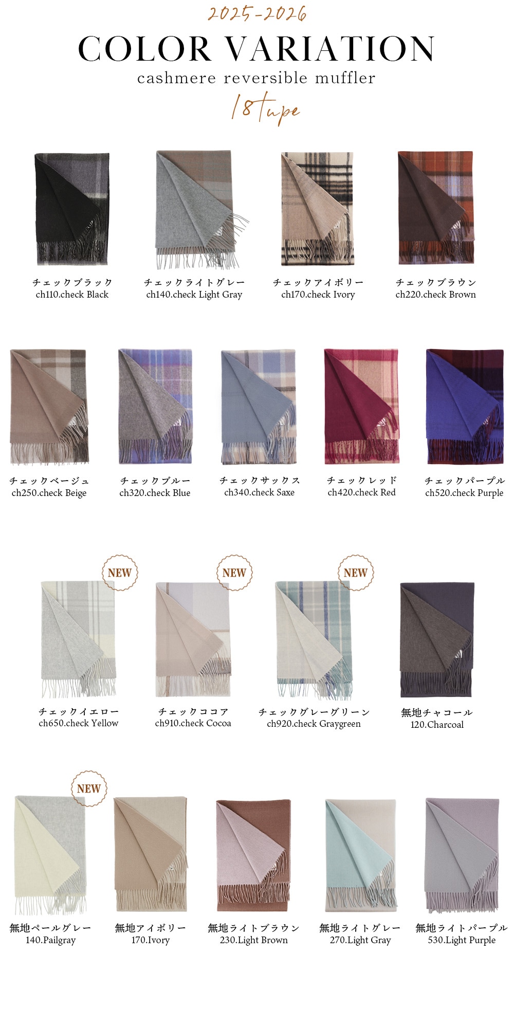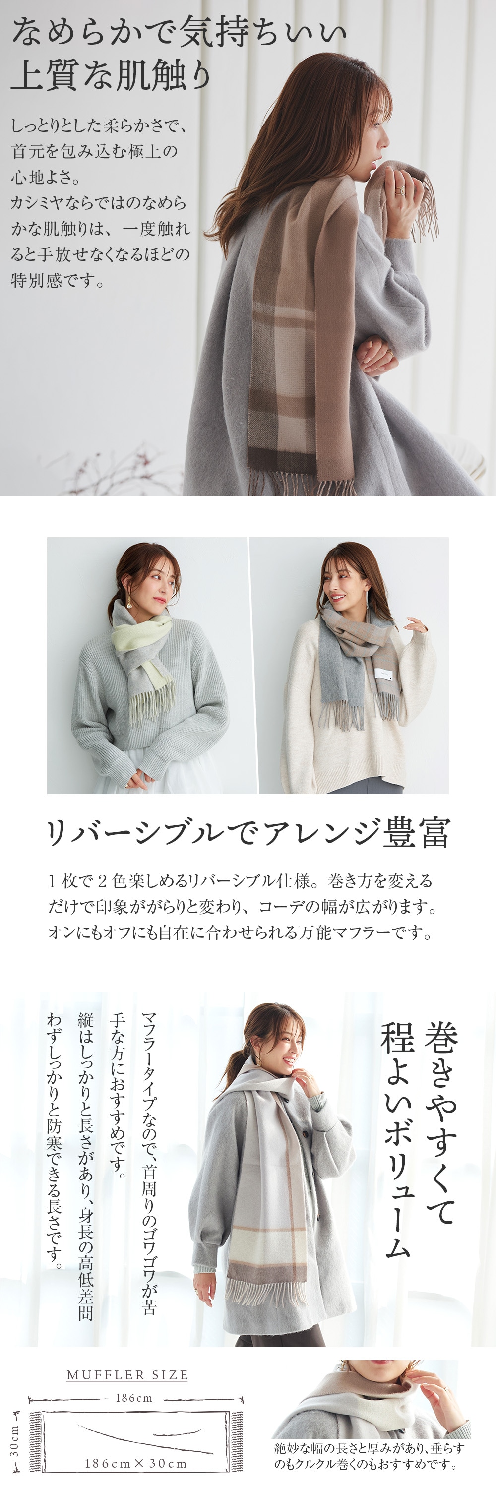 macoccaのカシミヤマフラーは、検査機関で品質検査をしたカシミヤ(内モンゴル産)100%。 密度が高く、光沢の入り方にも品があります。 本物のカシミヤの肌触りと暖かみを感じてください。 豊富なカラバリなので、シーンやスタイリングに合わせてお好みでお選びいただけます。表と裏で色や柄が違うリバーシブル仕様なので、巻き方のアレンジでコーデの幅が広がります。