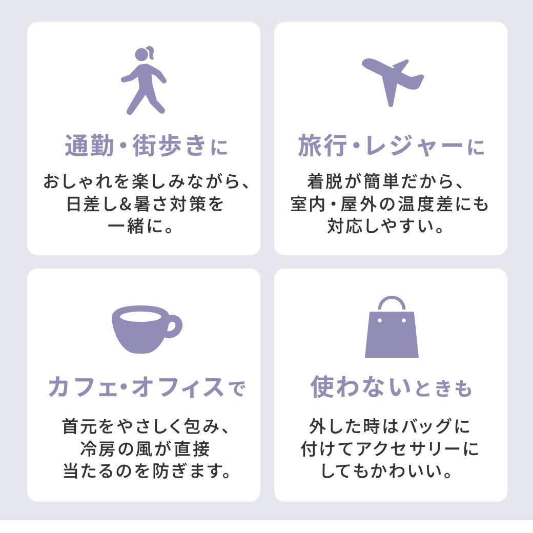 首元をやさしく包み、冷房の風が直接当たるのを防ぎます。